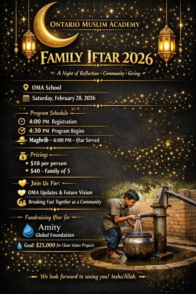 An inspiring evening of reflection and community, featuring updates on OMA’s future vision (2027+), a special talk by Br. Saad sharing his experiences from Africa and Asia and upcoming projects, an open house and school tour for interested parents, and the opportunity to break fast together as families, Insha’Allah.